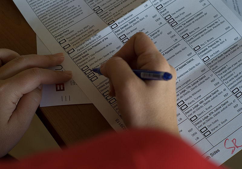 מצביעה מסמנת את בחירותיה בטופס ההצבעה בארה"ב | צילום: לארס פלוגמן, ויקיפדיה