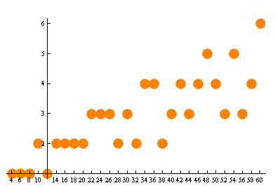 התפלגות מספר הייצוגים האפשריים לכתיבת מספר זוגי (מ-4 עד 60) | תרשים: Oleg Alexandro, ויקיפדיה