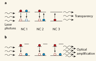 הקבוצה של קלימוב הצליחה לשנות, באמצעות הנדסה מתוחכמת של המבנה הגבישי, את מבנה הרמות של הננו-גביש, כך שמספיק עירור יחיד (ראו חלק (b)) כדי ליצור היפוך אוכלוסיה. זמן החיים של הרמה המעוררת הינו גדול פי 50 בגבישים החדשים ביחס לגבישים הרגילים. מאחר שעוצמת השאיבה הדרושה הינה פרופורציונית הפוך לזמן החיים של הרמה המעוררת, הרי שמדובר בשיפור בסדרי גודל.