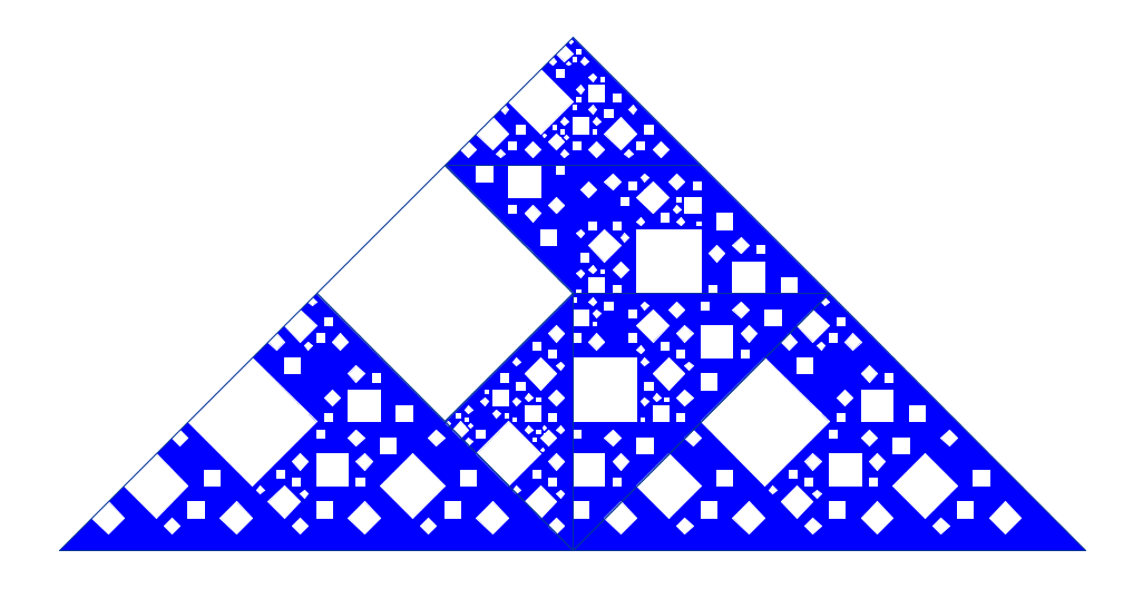 התהליך האינסופי שבו מפרקים את הצורות שמרכיבות את המשולש הכחול בתמונה למעלה לצורות קטנות יותר ומוחקים את כל הריבועים ייתן לנו משולש עם אינסוף חורים ריבועיים בגדלים שונים. האם משולש כזו בכלל הוא צורה דו-ממדית?