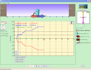 היישומון הזה פשוט יחסית לתפעול, אך אפשר ללמוד ממנו הרבה על הקשר בין כוח לתנועה. כדי לגרום להפעלת כוח על העצם, על שעליכם לעשות הוא ללחוץ עליו ולגרור אותו עם העכבר. ככל שתגררו אותו רחוק יותר, כך הכוח שיופעל עליו יהיה חזק יותר. כיוון הגרירה ישפיע על הכיוון של הכוח המופעל על העצם. שימו לב בהגדרות לסמן "הצג כוחות אופקיים", "הצג כוח שקול", לוודא שלא יופעל חיכוך ושהעצם הנבחר יהיה ארון (200 ק"ג). המתקדמים שבינכם יוכלו לשחק במקדמי החיכוך הקינטי והסטטי, וגם לשחק עם משקל הגוף ועם תאוצת הכובד. (אתם חושבים שהיא תשנה משהו? מדוע?)