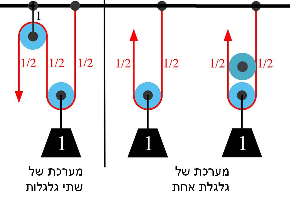על מנת שמערכת תהיה מוגדרת כמערכת של שתי גלגלות, כלומר מערכת בה צריך להשקיע רק כמחצית מהכח (תמורת מחצית מהדרך) לא מספיק שהכבל יעבור דרך שתי גלגלות כמו שמתואר סדוגמת המעלית, אלא הוא צריך לעבור דרך שתי הגלגלות באופן כזה שהכבל יעשה חצי סיבוב סביב כל אחת, ובכך יאבד מאורכו האפקטיבי במשיכת העצם כדלקמן: