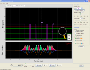 בחנו את רמות האנרגיה של בור בודד. אפשר לדוגמה לראות שמצב היסוד, שבו האנרגיה הנמוכה ביותר, כולל פשוט שיא אחד (גאוסיאן) במרכז הבור. אחרי שתסיימו לשחק עם בור פוטנציאל אחד, הגדילו את מספר הבורות לשניים. באמצעות זכוכית המגדלת תוכלו לראות שכל פס התפצל לשני פסים סמוכים. הבה נבחן את פונקצית הגל שלהם. פונקציית הגל של רמה 1 נראית פשוט כשני שיאים, אחד במרכזו של כל בור. פונקציית הגל של רמה 2 דומה מאוד אך שונה. גם בה יש שני שיאים, אחד במרכזו של כל בור, אולם קיים הפרש פאזה, כך שכאשר האחד מהם נמצא בשיא השני נמצא במינימום.