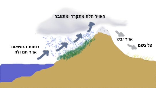 ככלל, אויר חם הוא בעל יכולת לשאת כמות רבה יותר של אדי מים (לחות) מאויר קר. ככל שטמפרטורת האויר יורדת יכולת נשיאת הלחות שלו יורדת. כלומר, יתכן מצב שבו אויר חם הנושא כמות רבה של לחות יתקרר עד כדי כך שלא יוכל לשאת עוד את כל הלחות, מה שיוביל להתעבותה לעננים ולירידת משקעים. תהליך זה מתרחש למשל כאשר אויר חם הנושא לחות רבה נישא על גבי רוחות לכיוון רכס הרים. כאשר רוחות אלו נתקלות בהרים הן נדחפות כלפי מעלה ומטפסות בגובה היכן שהלחץ האטמוספירי הנמוך גורם להתפשטות האויר ולהתקררותו (כחצי מעלת סלציוס לכל 100 מ'). כאמור, אם האויר מתקרר מספיק הלחות שבו תתעבה ויווצרו עננים אשר לעיתים גורמים לירידת גשמים. תהליך זה מתרחש בצד של הרכס הפונה לכיוון הים או האוקיינוס שהוא בדרך כלל המקור ללחות באויר.