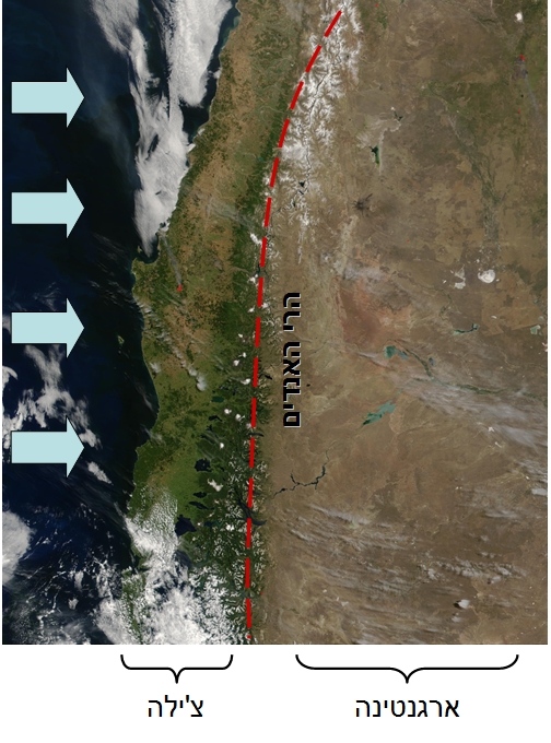 מדבר בצל גשם הנוצר על ידי רכס הרי האנדים בדרום אמריקה. רכס האנדים (המסומן בקו אדום), מהווה גם את הגבול בין צ'ילה (משמאל) וארגנטינה (מימין). בתמונת לווין זו ניתן לראות שבעוד שצ'ילה שופעת בצמחיה, אזור זה של ארגנטינה הוא מדברי. מדבר זה הוא כתוצאה של צל הגשם הנוצר על ידי רכס האנדים. החיצים מסמנים את הרוח הנושבת מכיוון האוקינוס השקט. (תמונת לווין בצבעים מקוריים, באדיבות סוכנות החלל האמריקנית).