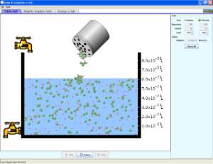 2. מלח קשה תמס: בחלק הזה של היישומון תוכלו לבחור בין כמה מלחים. שימו לב שכעת תגיעו לסף המסיסות מהר יותר מאשר עם מלח שולחן. נסו לראות איך גודל המולקולות, או מטען היונים המרכיבים אותן, (אפשר לראות גם את היחס בין היונים במולקולה) משפיע על מסיסות המלח.