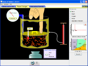 כעת נסו לשנות את החומרים בכלי וראו אם דיאגרמת הפאזות ומאפייניה משתנים. מתחת לשמות החומרים תראו גרף של אנרגיה פוטנציאלית על פי המרחק בין האטומים במולקולה. האם אתם מצליחים לראות קשר בין המרחק שבין האטומים במולקולה לבין המאפיינים של מעברי הפאזות? נסו לשחק עם המרחק בין האטומים (כוח המשיכה ביניהם) וראו איך יתנהגו החומרים החדשים שתייצרו.