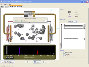 בצד ימין תוכלו לשלוט בסוג האטומים הנמצאים במנורה, שלכל אחד מהם מבנה שונה של רמות אנרגיה. תראו את רמות האנרגיה, וחשוב מכך במצב של אטום בודד תוכלו לראות מהי אנרגיית האלקטרון בשעה שהוא פוגע באטום. כמו כן תוכלו לפתוח ספקטוגרף שיראה לכם כמה אור נפלט מהמנורה בכל צבע.