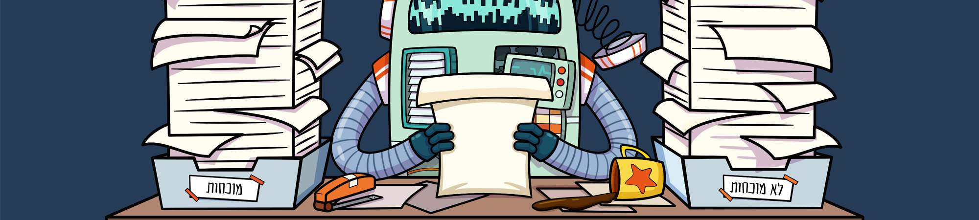 רובוט עם שני מגשים מלאים ניירות, עם הכיתוב "מוכחות" ו"לא מוכחות" | יוסי לגזיאל