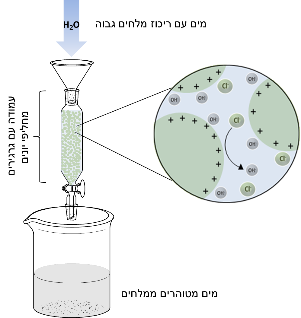 תאור סכמטי המתאר את המבנה ואופן הפעולה של שיטת חילוף היונים | איור: מאת המחבר