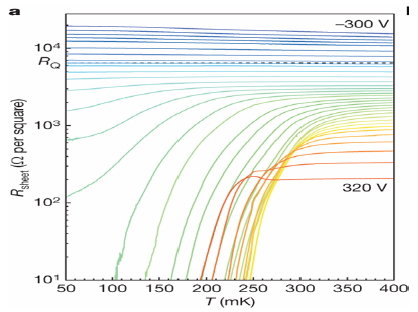 בתמונה משורטטת ההתנגדות הנמדדת של שכבת האלקטרונים הדו ממדית, בטמפרטורות שונות, ומתחים שונים של שכבת הזהב (אדום – מתח חיובי גבוה, כחול – מתח חיובי נמוך). במתחים שליליים, התנגדות השכבה אינה קטנה עם ירידת הטמפרטורה. במתחים חיובים גבוהים, ההתנגדות יורדת ל- 0, והשכבה הינה על מוליכה.