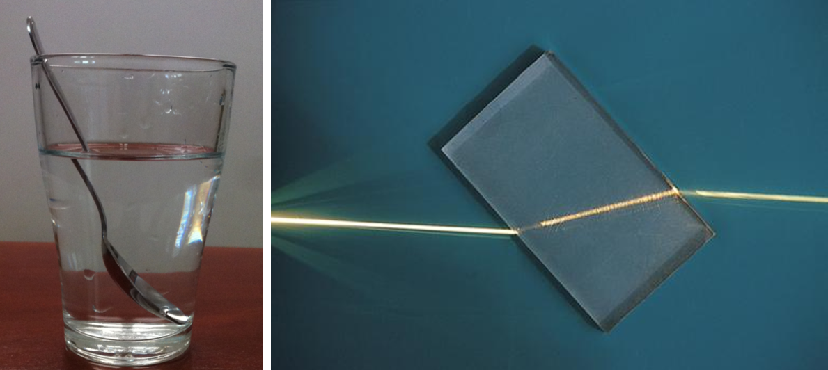מימין: קרן אור נשברת בחדירתה לתוך בלוק פלסטיק. משמאל: אשליה של כפית שבורה כתוצאה משבירת קרני האור | תמונות: ויקיפדיה(ajizai), מכון דוידסון