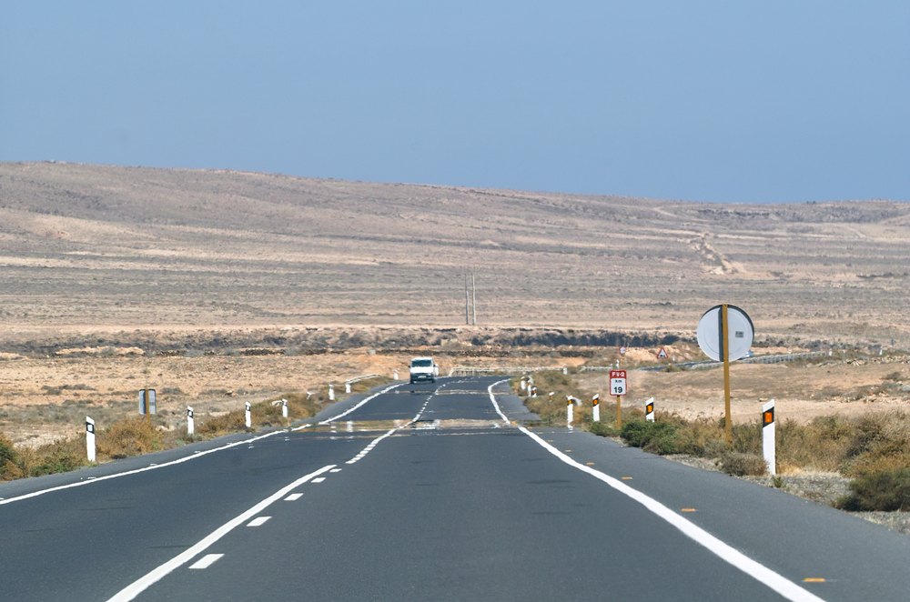 השתקפות ההרים והמכונית יוצרים אשליה של מים על הכביש הלוהט | תמונה: שאטרסטוק