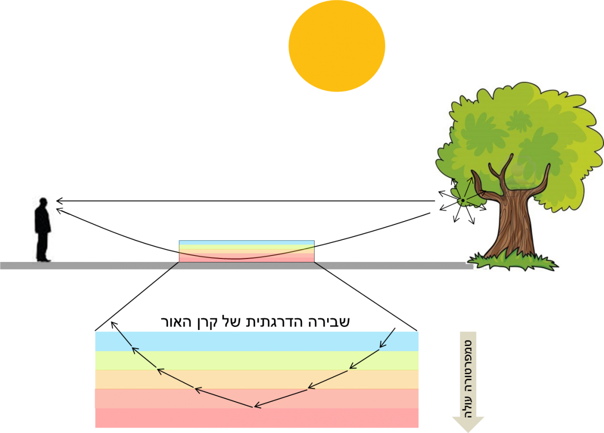 שבירה הדרגתית של קרן האור היוצאת מהעץ. הקרן מוחזרת מהכביש לעיניו של האיש שרואה את העץ משתקף מהכביש