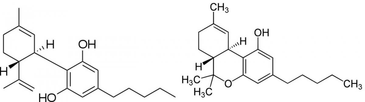 החומרים הפעילים בקנביס: THC (מימין) ו-CBD (משמאל) | תרשים: נחלת הכלל, ויקיפדיה
