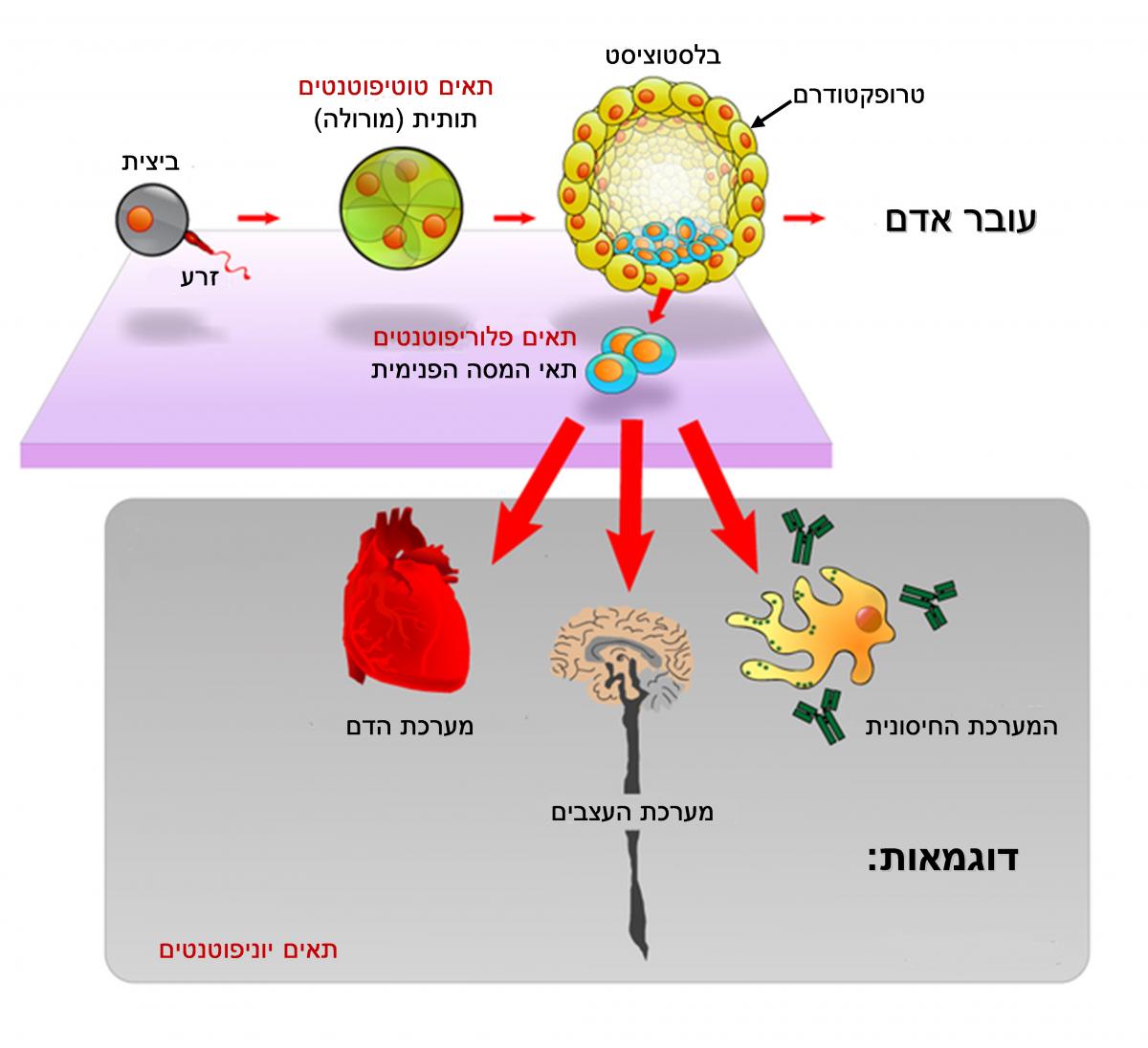 מהפריה ועד היצירה של תאי גזע עובריים. התרשים תורגם בידי צוות תקשורת המדע. מקור: ויקיפדיה, Mike Jones