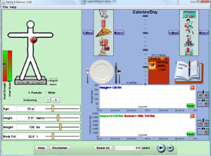 לאחר מכן כל שיישאר לכם הוא ללחוץ על "התחל" (משולש כחול למטה). בשני הגרפים תתקבל תמונה של השינוי במשקל ושל צריכה קלוריות מול שריפת קלוריות לאורך זמן. ככל שתשימו יותר אוכל עתיר קלוריות ותפחיתו את הפעילות גופנית, עך המשקל יעלה – ולהיפך (שימו לב לסכימת האדם מצד שמאל).