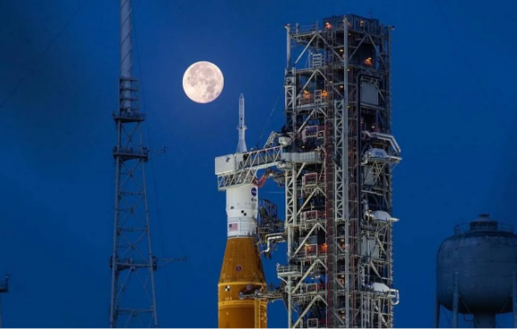 שיגור ארטמיס 1, עם הירח ברקע | NASA/Cory Huston