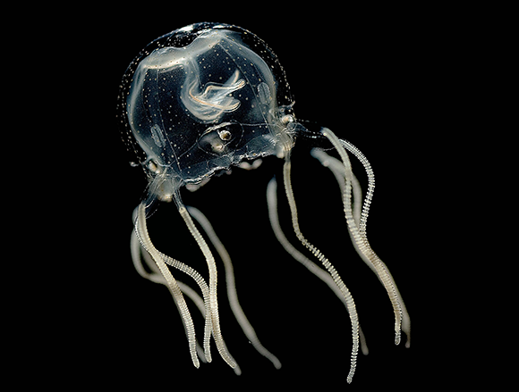 מדוזת הקופסה הקריבית (Tripedalia cystophora) חיה בסבך שורשי המנגרובים הצומחים באזורים טרופיים. במקום מוח יש לה ארבעה מרכזי חישה נפרדים, שבכל אחד מהם שש עיניים וכאלף תאי עצב. מערכת הראייה הפשוטה הזו מספיקה לה כדי לנווט את דרכה בין השורשים. חוקרים משווייץ ומספרד החליטו לבדוק איך המדוזות מצליחות לנווט אפילו במים עכורים, כשהניגודיות בין השורשים למים נמוכה.