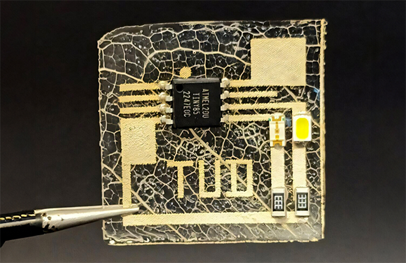 שילוב של שלד העלה עם פולימרים טבעיים ועליו רכיבים אלקטרוניים. לוח עליטרוני | קרדיט: Kai Schmidt