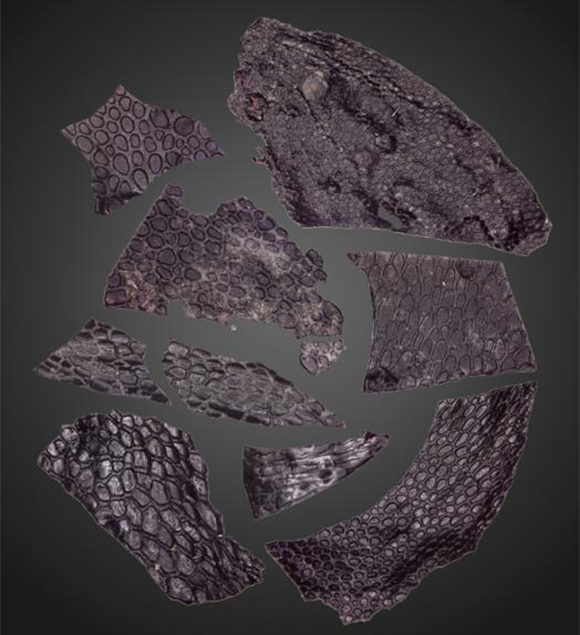 החוקרים משערים שהעור המאובן מייצג את המצב הקדמון אצל כל בעלי החוליות היבשתיים שאינם דו-חיים. פיסות העור המאובנות | Current Biology/Mooney et al