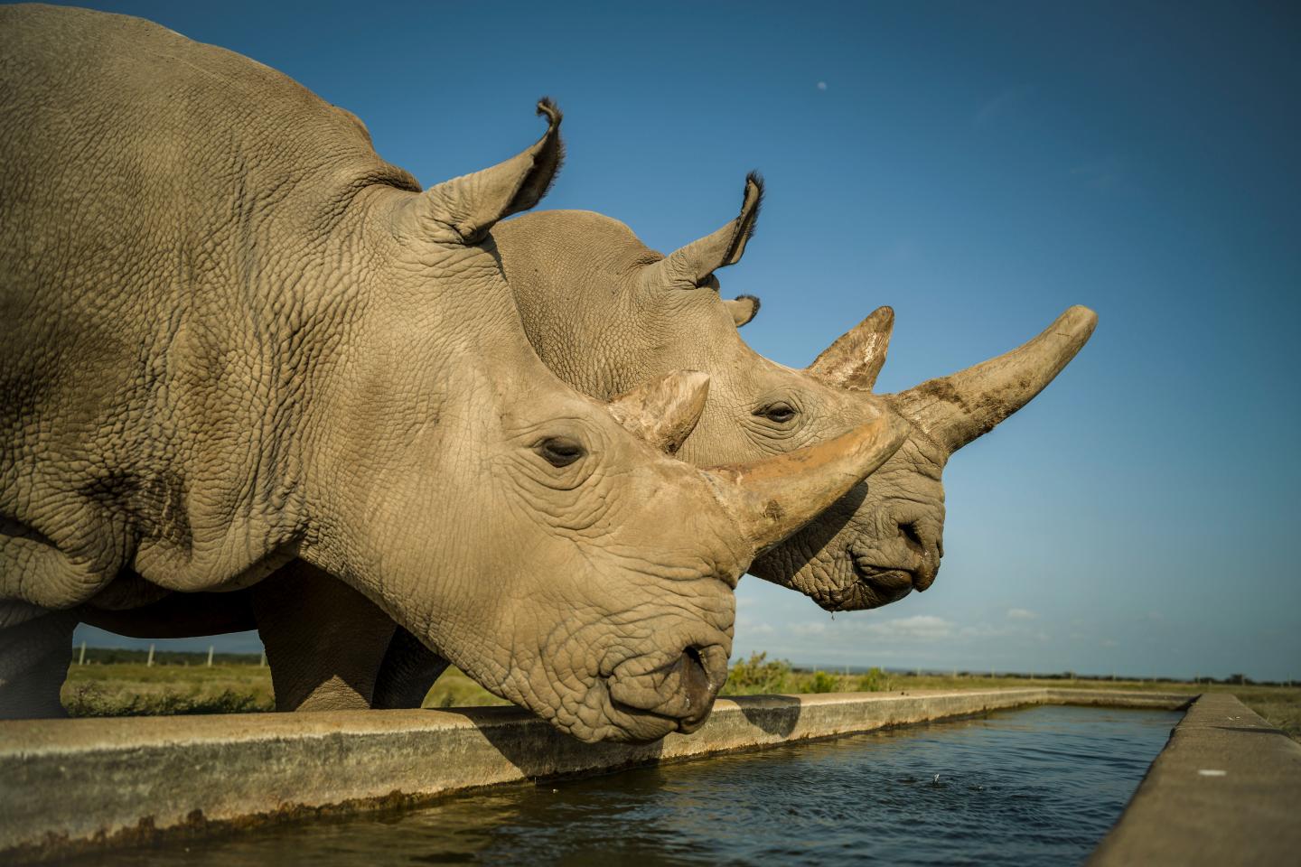 שתי הקרנפיות הלבנות הצפוניות האחרונות בשמורת Ol Pejeta , בה הן גרות. צילום: Ami Vitale