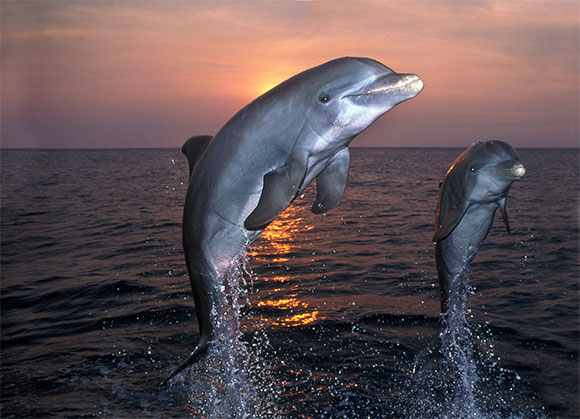 הרעש מקשה על דולפינים לשתף פעולה ביניהם. שני דולפינים קופצים יחדיו מהים | slowmotiongli, Shutterstock