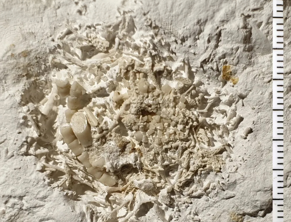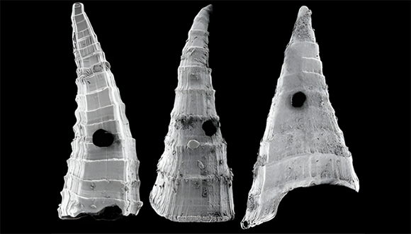 השלד החיצוני של הנטרף הפך לעבה יותר, בעוד אצל הטורף השתפרה היכולת לחורר שריונות. “לוחות שריון” מחוררים של Lapworthella fasciculata | מקור: R. Bicknell, et al (2025) Current Biology