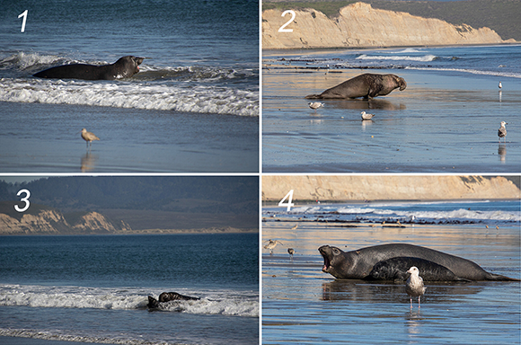 זה התיעוד הראשון של התנהגות אלטרואיסטית כזו מצד זכרים של פילים ים. בתמונה: 1: הנקבה קוראת לגור 2: הזכר נכנס למים 3: הזכר והגור מגיעים לחוף 4: הנקבה והגור מאוחדים | מתוך המאמר, Allen et al 2024