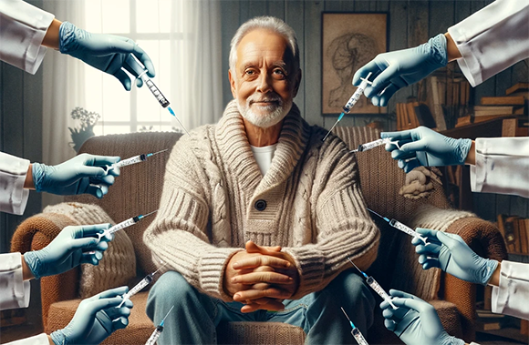 התחסן בניגוד להנחיות, ומסיבות לא ברורות, ב-217 מנות חיסון נגד קורונה. אדם מקבל חיסונים רבים | שירה הולנד באמצעות DALL-E