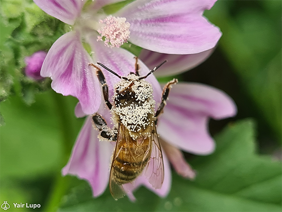 דבורת דבש נושאת גרגירי אבקה | צילום: יאיר לופו. תמונות נוספות בפייסבוק בקבוצת “עולם הדבורים”