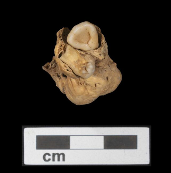 כשהארכיאולוגית מלינדה וצל (Wetzel) בחנה את הגוש בקפידה, היא זיהתה משהו דמוי שן מבצבץ ממנו. במבט נוסף היא זיהתה שהממצא יושב בתוך שקע של רקמת עצם. בסמוך נמצאה שן נוספת, שהתאימה בצורתה לחלל ריק בתוך הגוש, כך שנראה שהיא הגיעה ממנו. בתום כמה בדיקות, בין השאר כדי לפסול את האפשרות שמדובר ברקמה של עובר, או הסברים חלופיים אחרים, קבעו החוקרות שמדובר בגידול נדיר, בשם טרטומה, שהתפתח בשחלה.