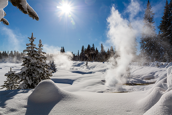 ייתכן שנביעות מים חמים סייעו לעצים לשרוד. מעיינות חמים בנוף מושלג | The Sturdy Table, shutterstock