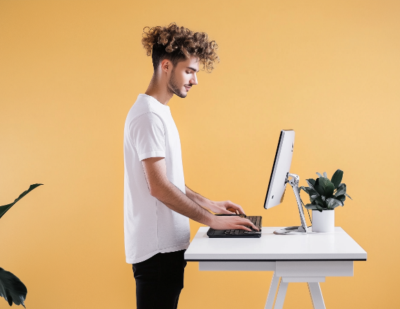 הממצאים הראו כי אין תועלת בריאותית משמעותית בעמידה לעומת ישיבה. איש צעיר עובד מול שולחן עמידה | ליאת פלי באמצעות מידג’רני