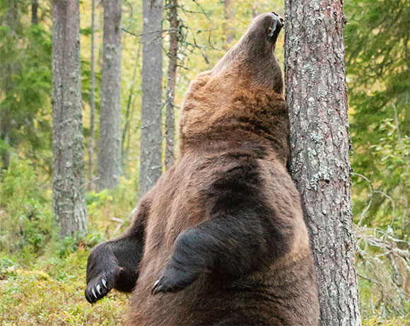 לא רק מתגרדים, גם מתמרחים בשרף דוחה טפילים. דוב חום מתחכך בגזע עץ בפינלנד | Agami Photo Agency, Shutterstock