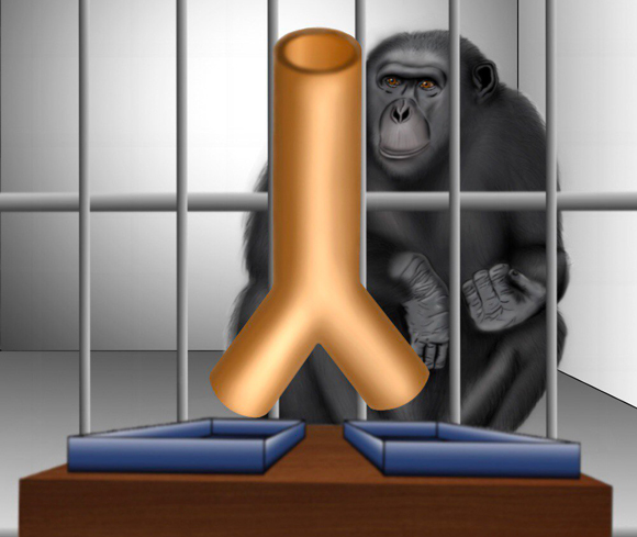 החלטות רבות דורשות מאיתנו להביא בחשבון כמה תרחישים שונים, שאולי יתממשו ואולי לא. במחקר חדש, חוקרים מארצות הברית ומאירופה בחנו את היכולת הזו אצל שימפנזים. הם הציבו מולם מתקן המורכב מצינור בצורת Y הפוך, שעומד מעל משטח לא יציב. על המשטח הונח אוכל טעים, וכאשר חוקר הפיל אבן דרך הצינור על המשטח, היא גרמה לו לנטות הצידה ולאוכל ליפול, הרחק מהשג ידם של השימפנזים. קופי האדם יכלו לשלוח יד ולייצב את המשטח, כך שהאוכל נשאר עליו גם כאשר האבן פגעה בו. בשל צורת הצינור, האבן יכולה ליפול באקראי על המשטח השמאלי, או על הימני: אלו שני התרחישים שהשימפנזים צריכים לשקול. 13 מתוך 15 השימפנזים הבינו זאת, וייצבו את שני המשטחים גם יחד, אחד בכל יד.