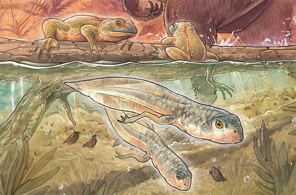 חי בבריכות עונתיות במהלך תור היורה, לפני כ-165 מיליון שנה. אילוסטרציה של הראשן והצפרדע אליה יתפתח | Gabriel Lío