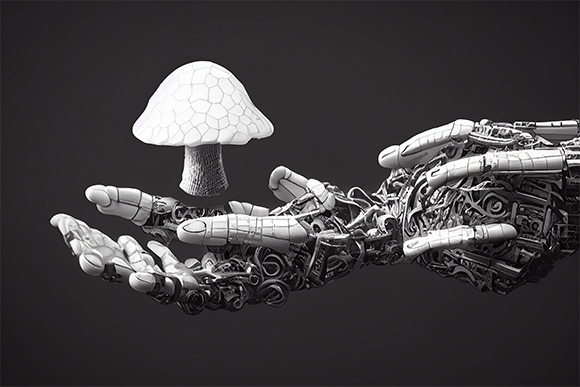 פטריות – מועמדות מבטיחות לשימוש ברובוטים ביו-היברידיים. יד רובוטית מחזיקה פטרייה | Room27, Shutterstock