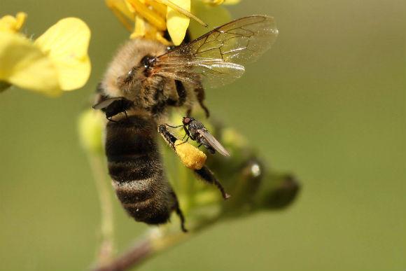 זבובים טורפים נהנים מטרף העכבישים בעומדם על דבורת דבש | צילום: ד”ר נעם לויתן