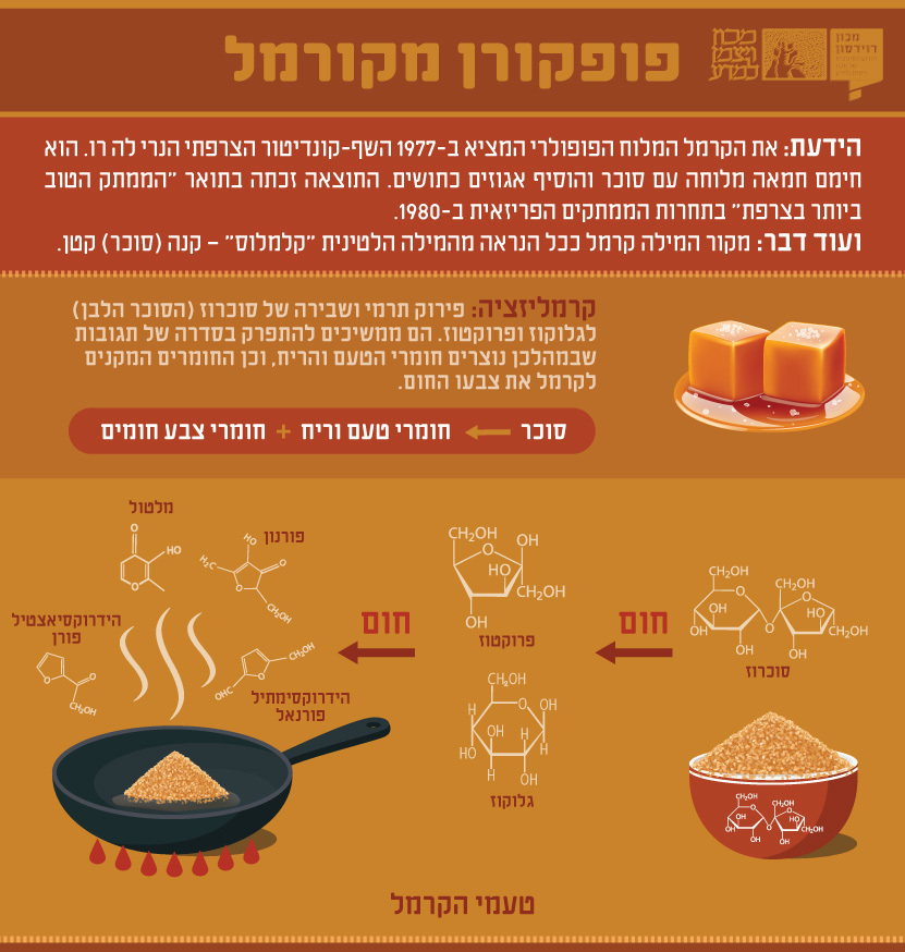 פופקורן מקורמל מורכב משני מרכיבים שונים מאוד: קרמל ופופקורן. כל אחד מהם מעניין כשלעצמו, ושילובם יחד מעניין אף יותר. הראשון הוא גרעיני התירס המתפקעים, שהופכים למעין פרחים לבנים, תְפוחים ואווריריים. בתהליך ההתפקעות, המים שבתוך גרעין התירס מתחממים והופכים לאדים, עד שלחץ הגז מבקע את מעטפת הגרעין וגורם לעמילן הנוזלי שבתוכו להינתז החוצה ולהתמצק כהרף עין לגוש לבן ואוורירי, במעין פיצוץ מהיר.