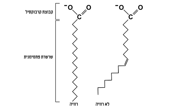 המבנה המרחבי של חומצת שומן רוויה ישר ופתוח, ואילו לחומצת שומן בלתי רוויה מבנה מכופף וזוויתי. מבנה מולקולה של חומצות שומן רוויה (שמאל) ובלתי רוויה | Ali Damouh / Science Photo Library