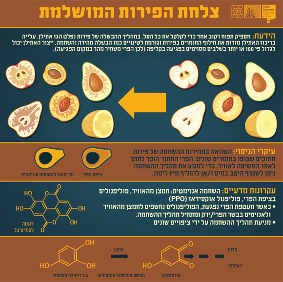 בפירות ובירקות יש קבוצת חומרים שנקראים פּוֹליפֶנוֹלים. חומרים אלה הם נוגדי חמצון. הפוליפנולים נשמרים בתוך מעין קופסאות קטנות בתאי הצמח. בקופסאות אחרות בתאים נשמר אנזים בשם פוליפנול אוקסידאז (PPO), שמסוגל לחמצן פוליפנולים. כאשר אנחנו חותכים את הפרי או הירק, ה”קופסאות” הקטנות נפגעות והפוליפנולים נחשפים לחמצן ול-PPO. כתוצאה מכך מתחילה שרשרת תגובות שיוצרת חומרים שצבעם חום. המלנין, הפיגמנט שנותן את הגוונים הכהים לעיניים, לשיער ולעור, שייך למשפחת חומרים זו.