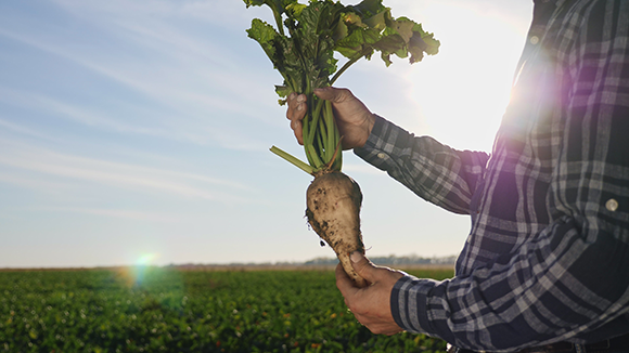 צבעו של סלק סוכר הוא לבן, טעמו מתוק מאוד והוא גדול יחסית לזני הסלק האחרים. איש מחזיק סלק סוכר | Shutterstock, DedovStock