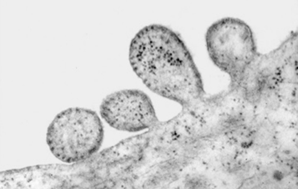 נגיף החצבת בתהליך הנצה מתא חולה| צילום במיקרוסקופ אלקטרונים: פרופ' שמואל רוזנבלט, אונ' ת"א