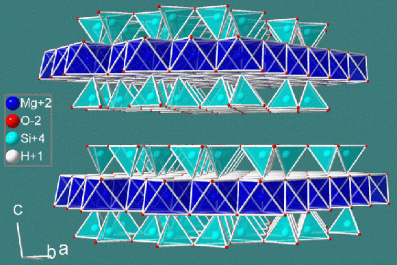 מינרל נפוץ, שמכיל בעיקר חמצן, צורן (סיליקון) ומגנזיום. המבנה של טלק | איור: Materialscientist, CC BY-SA 3.0, via Wikimedia Commons