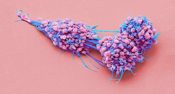 הראיות לקשר בין שימוש בטלק לסרטן שחלות חלשות מאוד. צילום מיקרוסקופ אלקטרונים צבוע של תאי סרטן שחלות | מקור: Steve Gschmeissner / Science Photo Library