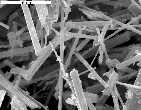 אם יש קשר בין שימוש בטלק לסרטן שחלות אולי הוא נובע מזיהום באסבסט. צילום מיקרוסקופ אלקטרונים של אמוסיט (אסבסט חום) | צילום: Denver Microbeam Laboratory, U.S. Geological Survey