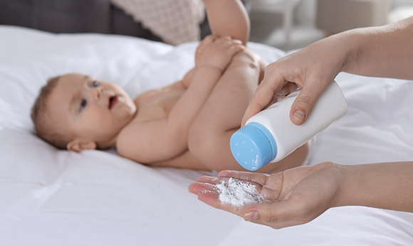 שאיפת אבקה מכל סוג עלולה לגרום לבעיות בריאות אצל תינוקות. אם, תינוק ואבקת גוף לטיפול בתינוק | צילום: New Africa, Shutterstock