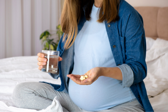 ויטמינים ומינרלים, בכמות הנכונה, הכרחיים לפעילות תקינה של הגוף, ומחסור בהם יכול להוביל למחלות שונות.אישה בהריון לוקחת טבליות | Shutterstock, Nemer-T