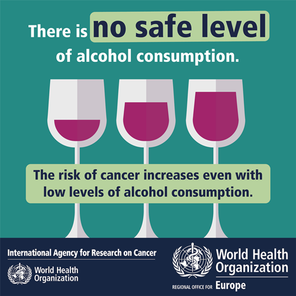 אין רמה בטוחה לצריכה של אלכוהול. כרזה של הסוכנות הבינלאומית לחקר הסרטן (IARC) שהיא זרוע מחקר של ארגון הבריאות העולמי | מתוך אתר הסוכנות